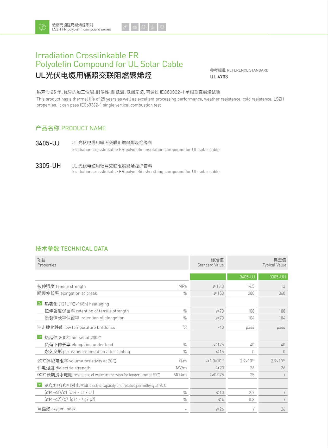 UL光伏电缆用辐照交联阻燃聚烯烃
